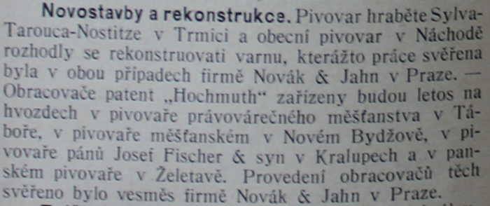 Čeští sladaři a pivovarníci měli k dispozici i odborné časopisy. V roce 1873 byl založen časopis Kvas, jeho pokračovatelem je v současnosti časopis Kvasný průmysl. V letech 1883 až 1918 vycházel odborný časopis Pivovarské listy. A právě z těchto listů se například dozvídáme i bližší informace o rekonstrukci Sladovnické věže. Konkrétně vděčíme ing. Starcovi, který pilným studiem Pivovarských listů z roku 1908 na straně 170 objevil zmínku o realizaci vybavení hvozdu firmou Novák&Jahn. A dokonce potvrdil i patent Hochmuth.